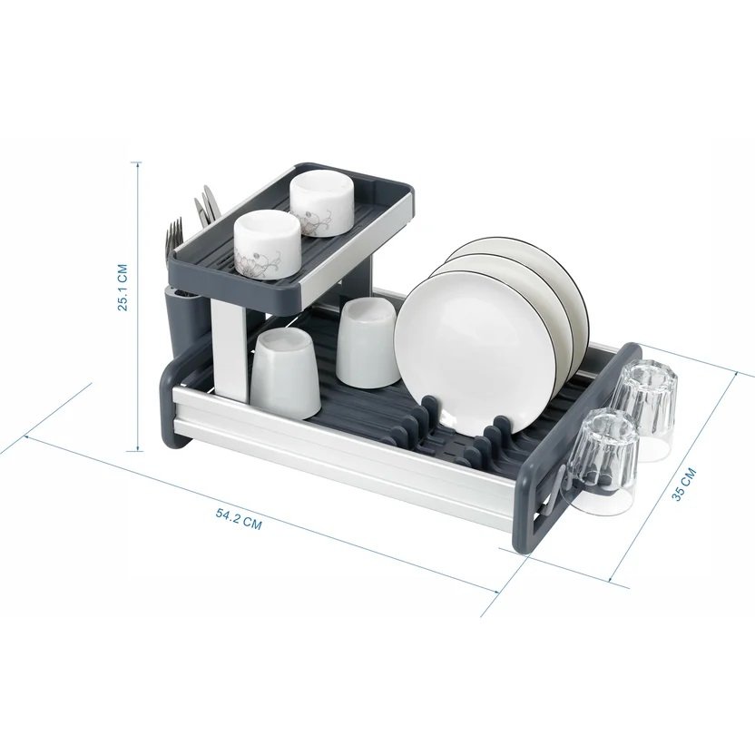 égouttoir à vaisselle Premium à deux niveaux en aluminium. Ce modèle compact optimise l’espace tout en séchant efficacement plus de vaisselle, grâce à son design moderne et sa robustesse antirouille.